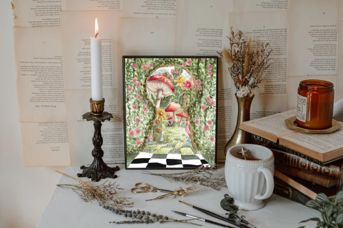 This literary location book lover gift wall art print features a hand painted scene of a rosebush surrounding the garden of Wonderland in the Alice story by Lewis Carroll. It is the perfect gift or addition to hang in the home of anyone who loves being immersed in a good book or to gift to the reader in your life! This a digital reproduction of a hand painted design.