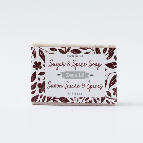Dot and Lil's Sugar & Spice scent is back after many years away! We've brought back this nostalgic favorite from the Dot & Lil fragrance archives for the holidays. Like a fresh baked, warm ginger cookie with base notes of spicy cardamom and cinnamon. Perfect for fall, winter and the holiday season. Dot & Lil soap is made from an all-vegetable oil and glycerin base. This soap is entirely vegan. Like all Dot & Lil soaps, it has plenty of lather and lasts a long time! Each soap weighs 128 g/4.5 oz. Ingredients: soap base [glycerin, sodium stearate, sodium myristate, cocos nucifera oil (coconut oil), olea europaea (olive oil), limnanthes alba seed oil (meadowfoam oil), titanium dioxide], parfum, mica, elettaria cardamomum (cardamom).